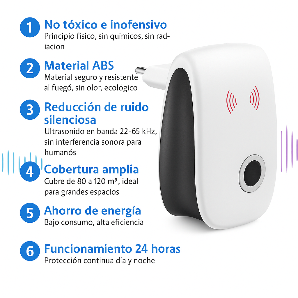 El repelente ultrasónico emite sonidos de alta frecuencia que son inaudibles para los humanos, pero molestos para los insectos. Esto te permite disfrutar de un ambiente tranquilo sin ruidos molestos.