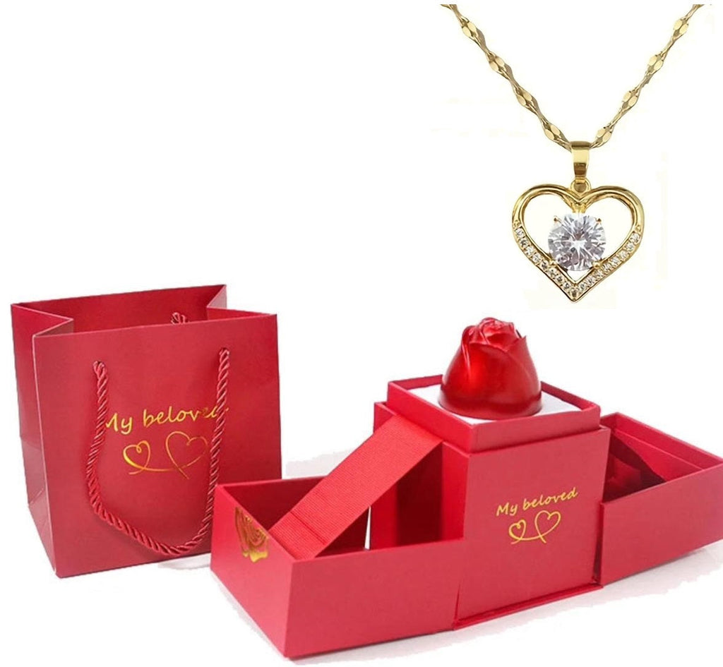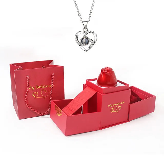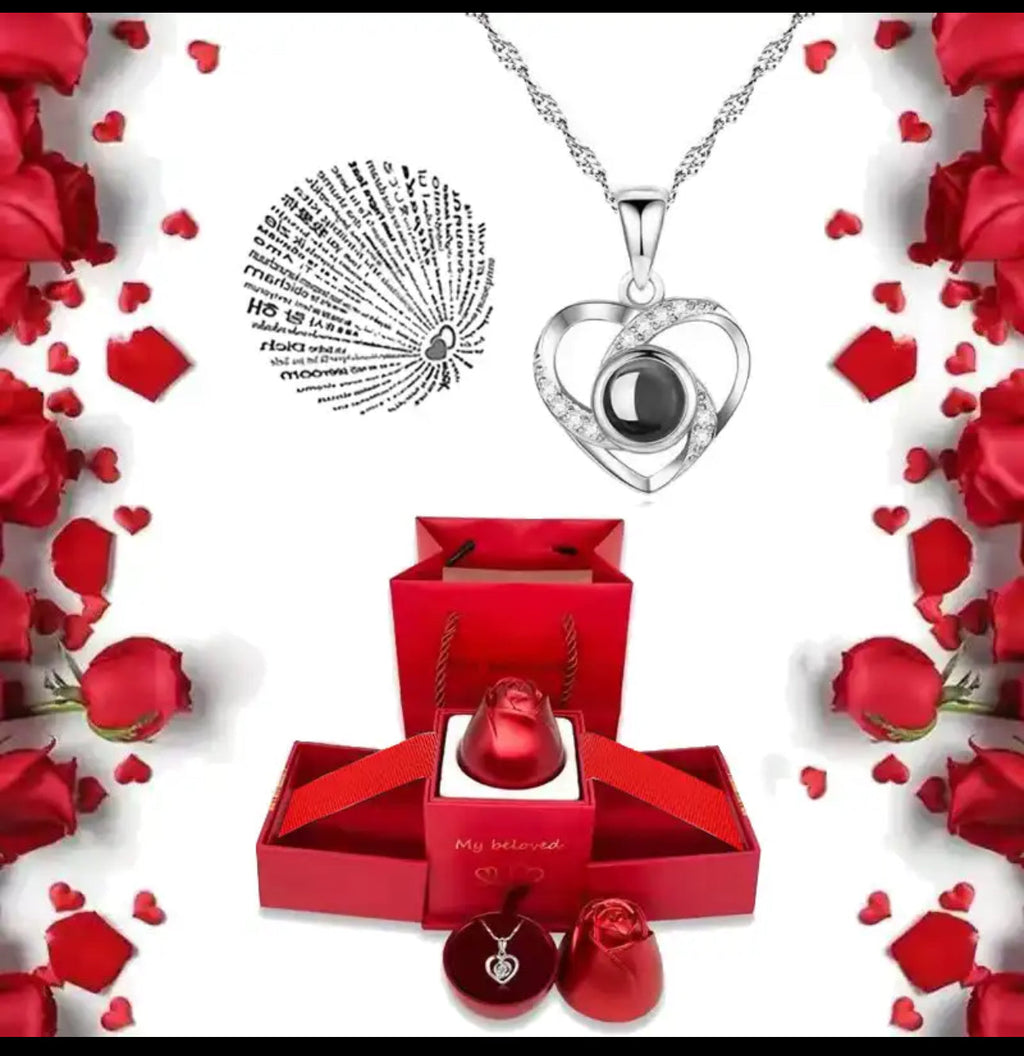 *En el interior descubre una llamativa rosa la cual abre para encontrar un fino collar cuyo colgante muestra las palabras "Te amo" en 100 idiomas.