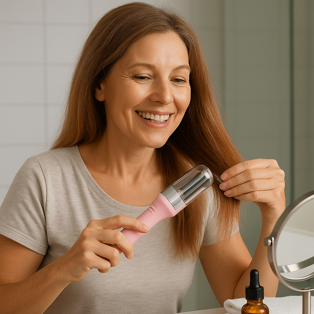 A diferencia de las tijeras convencionales, esta recortadora utiliza una luz Blue Ray 💡 que protege cada hebra durante el corte, evitando el debilitamiento del cabello. Además, incluye un peine 2 en 1 que alisa y repara al mismo tiempo 🪮.